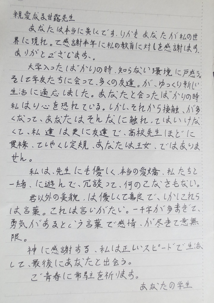 本网讯(记者长风)“感谢上帝,我用正确的速度,才会与你相遇。”这不是普通的情书,而是一名大一新生用日文写给辅导员的一封信。近日,我系工程1501专业学生吕晋给辅导员甘露老师写了一封日文书信在网上流传。
