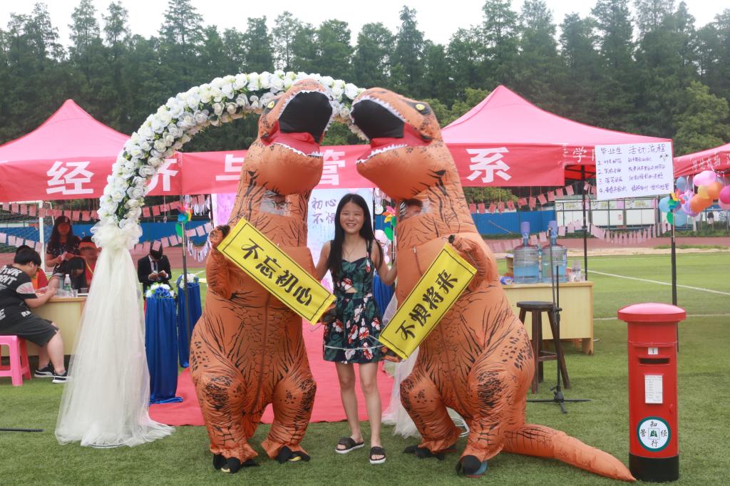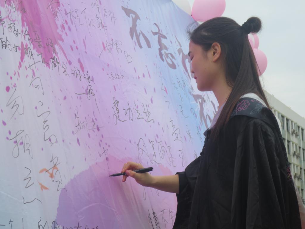 操场的正西方,经济与管理系毕业生与他们的老师站在一起留念合影,留下最难忘的毕业照。即将毕业的他们,每个人的脸上都挂着笑容,那笑容是经历了大学的磨砺而绽放的。在经管系帐篷处,红毯,鲜花,气球,照片,那是专属于经管系的地方,走上红毯,拿起马克笔,在经管的签名墙上留下字迹,在自己的照片背后留下寄语,投递一封给十年后自己的信,唱一首送给大学的歌,留下专属于大学的回忆。