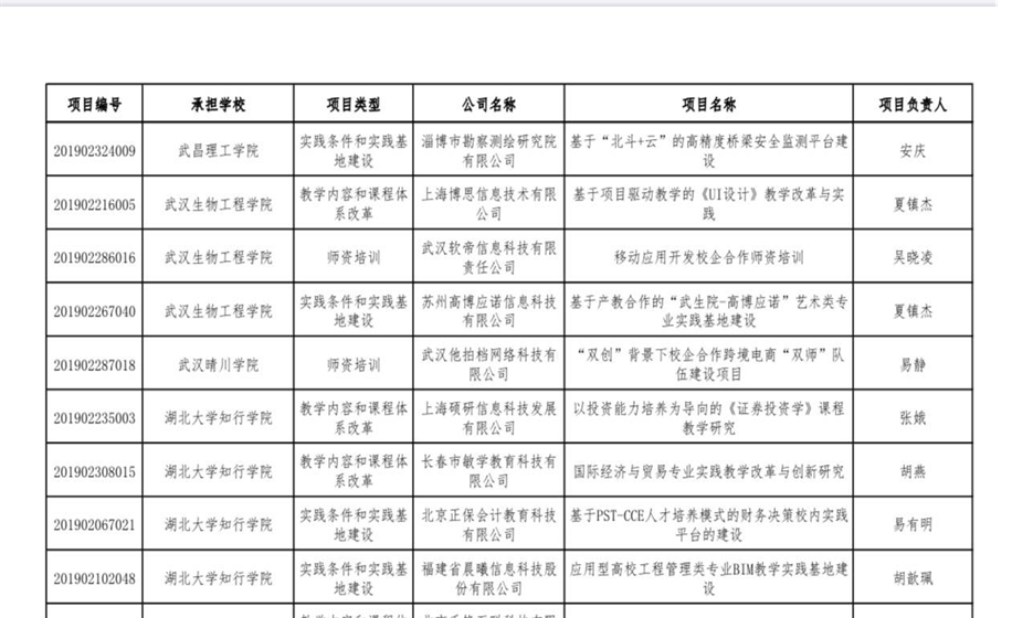 近日,从教育部高教司发布的《教育部高等教育司关于公布2019年第二批产学合作协同育人项目立项名单的通知》中获悉,永利集团4个项目获批立项,其中yl9193永利集团获批3项。项目涉及教学内容和课程体系改革、实践条件和实践基地建设等,其中教学内容与课程体系改革类在湖北大学视为省级教改类项目。