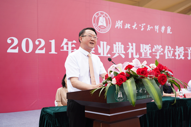 毕业典礼致辞中,卜校长细数了2021届毕业生在校期间的骄人成长答卷,充分肯定了毕业生们取得的成绩,与大家共同回顾了学校近年来在党的建设、人才培养、专业建设、教学科研、办学条件、社会声誉等方面取得的成绩,并紧紧围绕前不久习近平总书记考察清华大学时的重要讲话精神,勉励同学们勇做新时代的奋斗者:一是要用远大志向激发奋斗动力。要始终听党话、跟党走,自觉将“小我”融入“大我”之中,把报效祖国作为人生的最大追求,把服务人民作为人生的最大责任,把奉献社会作为人生的最大价值。二是要用崇德修身砥砺奋斗品格。要自觉做社会主义核心价值观的践行者,做先进文化的传承者,做正确价值标准的坚守者,做道德修为的示范者,学会明辨是非曲直,不为人情所扰、不为世风所困、不为物欲所动、不为名利所累,始终在“明大德、守公德、严私德”的道德实践中砥砺奋斗品格。三是要用学以广才提升奋斗本领。要常怀“空杯心态”,笃定终身学习的理念。要坚持向实践学,主动到一线蹲点、到艰苦地区锻炼、到难点岗位实践。要虚心向群众学,用心学习群众的优秀品德、务实作风、朴素情感和首创精神。四是要用脚踏实地迈稳奋斗步伐。要坚持从点滴小事做起,从认真对待每个细节开始,用自己每天前进的一小步,去迎接未来改变人生的一大步。卜校长最后动情地对毕业生们说,知行永远是你们温暖的家,你们永远是我们心中最可爱的少年,心有所属,时时是归期,处处是归途,欢迎同学们常回家看看!衷心祝愿同学们前程似锦、平安幸福!