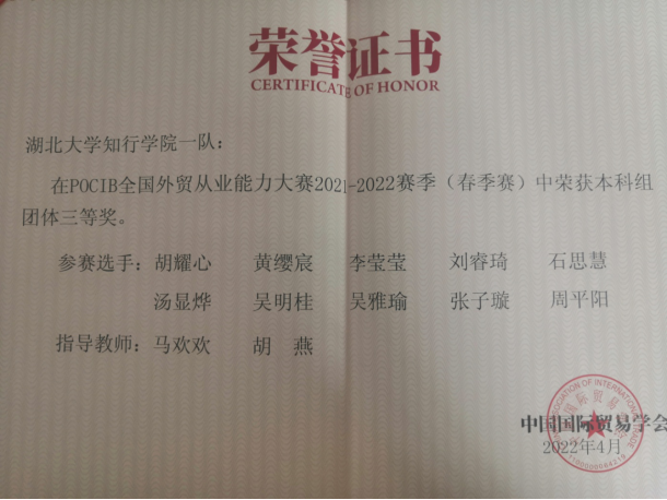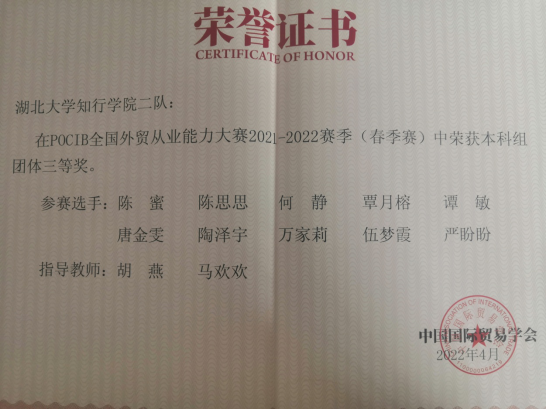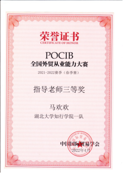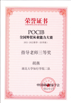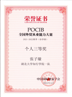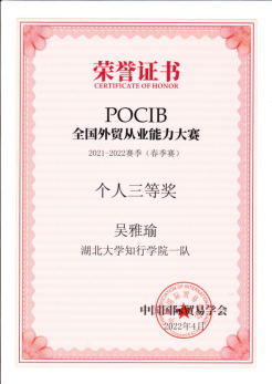 POCIB大赛是由中国国际贸易学会主办的全国性的外贸从业能力比赛,经过十年的发展,POCIB全国外贸从业能力大赛已成为外经贸相关专业领域参赛人数最多,最有影响力的大赛。本届大赛于2022年4月15日正式启动,历时15天,全国共有184余所高校参与角逐,共373支队伍,3730名参赛选手,于2022年4月29日上午10时圆满结束。