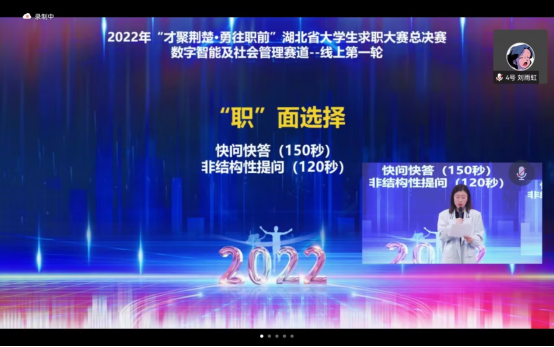 为贯彻落实党中央、国务院关于促进高校毕业生就业的决策部署和省委、省政府工作要求,11月19日,“才聚荆楚·勇往职前”湖北省大学生模拟求职大赛数字智能及社会管理赛道线上决赛落下帷幕,我校人力资源管理2001B班刘雨虹同学参加进行选拔。