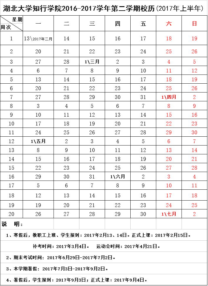 2017年上半年校历(2017年1月6日更新)