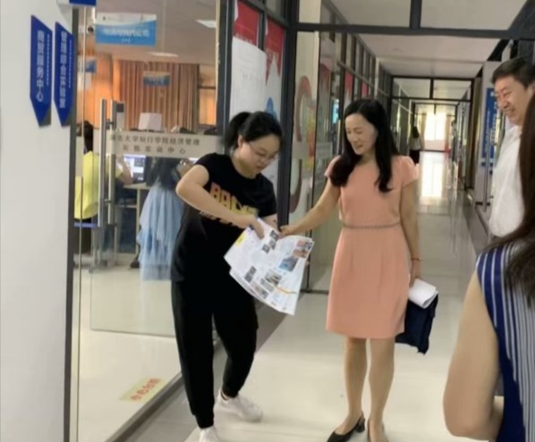 管理员老师向钟春敏校长展示《今视传媒》的报纸