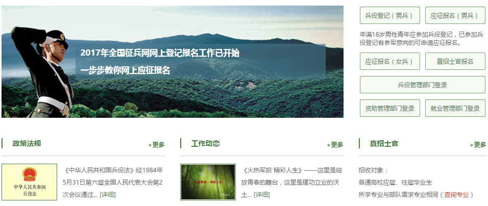 编者语:有些小伙伴看到这么多的菜单就有些懵了,其实不用紧张,如果你是第一次来的男生,直接从“兵役登记(男兵)”进入页面就可以了;否则就从“应征报名(男兵)”进入页面;如果想报名直招士官,就从“直招士官报名”进入页面,不过,今年的士官直招貌似还没开始 -_-!!