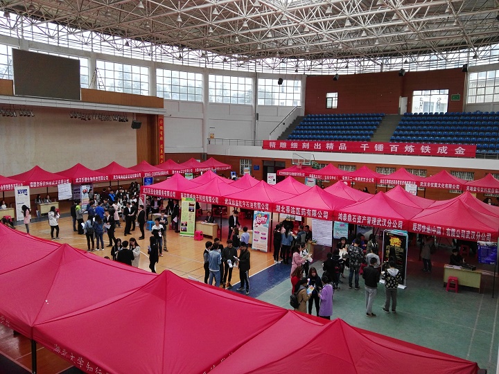 武汉市各类公司来我校选拔人才,即将毕业的大四学子们纷纷到此,咨询自己感兴趣的公司。正如体育馆内张贴着的“精雕细刻出精品,千锤百炼铁成金。海纳百川终破浪,厚积勃发在此时”的横幅,以此来激励我院学子们努力学习,提升自己。