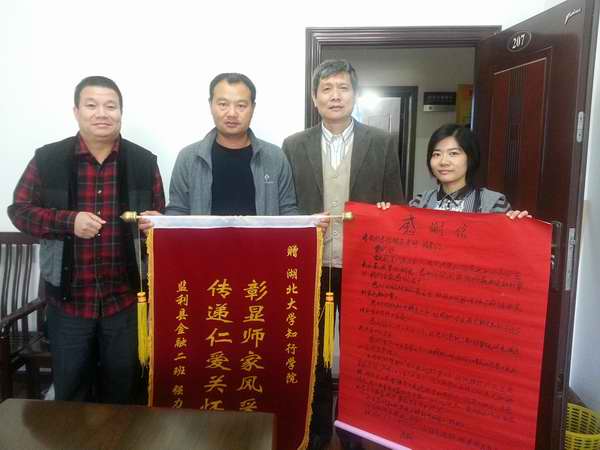 本网讯(通讯员 刘星)“谢谢你们,谢谢同学们,是你们让我们一家渡过了难关。”经管系金融13级强力同学的父亲拉着经管系书记舒展的手动情地说到。11月4日上午,强力同学的父亲和姑姑不远千里,从监利老家前来学院,向学院送来感谢锦旗和家人亲笔书写的红纸海报感谢信,向全院师生为强力同学爱心募捐的善举表达诚挚的谢意。
