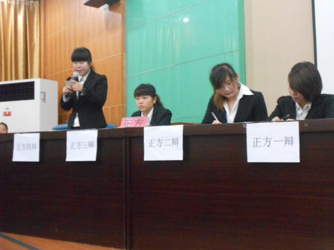 首先,文艺部的优秀个人为我们带来了精彩的舞蹈,观众兴致勃勃,欣赏着精彩表演。紧接着,在观众的期待与欢呼声中,由正方——市场营销1201z的代表,反方——物流1202G 的代表,在“道不同不相为谋”与“道不同亦相为谋”的辩题中开始了季军争夺赛。反方列举了很多例证,例如:共产党与国民党合作问题,秦国统一问题等等; 正方则举例中国与日本道不同不相为谋 等等;整个辩论过程中,双方选手思维敏捷,应用大量例证来支撑观点,令在场观众心悦诚服。在观众提问环节,观众对反方四辩的提问可谓精彩致极, 评委对各方也进行了精辟的点评 。