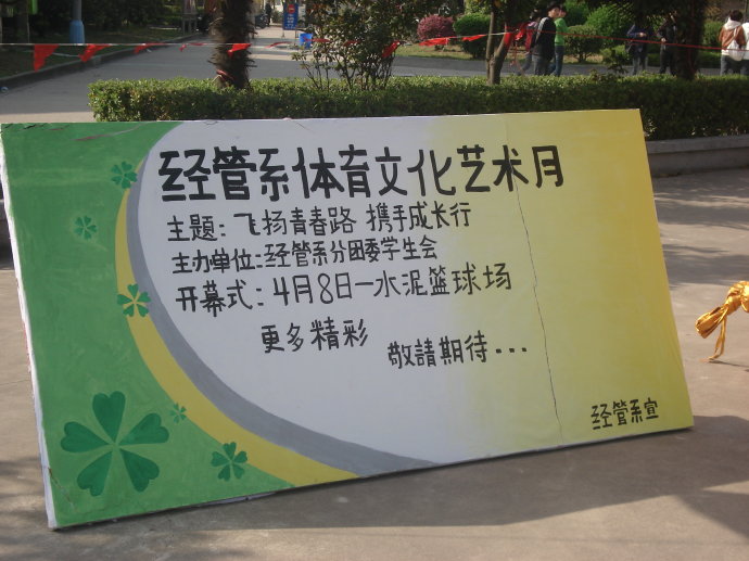 2010年4月8日,下午四点,为了丰富大学生的业余生活,经管系组织了第二届体育艺术月开幕式。随着文娱部的一首《奔跑》开始了此次活动开幕式。紧接着是优美的小提琴独奏,开幕式掌声不断,高潮部分则是琵琶及其武术,精辟的武术配合着琵琶的奏乐得到了热烈的相声。最后漂亮的文娱部女生带来的傣族舞蹈结束本次开幕式。带着同学们的期望,第二届体育艺术月正式开始了。
