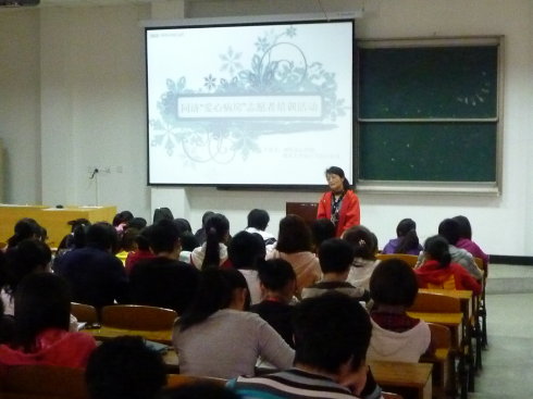 此次活动由爱心联盟的刘老师主持,在舒缓温馨的背景音乐声中,刘老师在详细的介绍了在探望白血病儿童要注意的一些细节的同时也讲述了她自己与白血病儿童之间的那些感人的故事,现场气氛非常感人,甚至有的女生在听完了一篇身患白血病的女孩写的作文后情不自禁的流下泪水!活动接近尾声的时候,刘老师对大家进行了一次现场模拟,让我们更加真实的了解到了如何解决在看望白血病儿童中的实际问题。最后,在“365天,天天爱心相随”的口号声中,活动完美结束!
