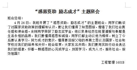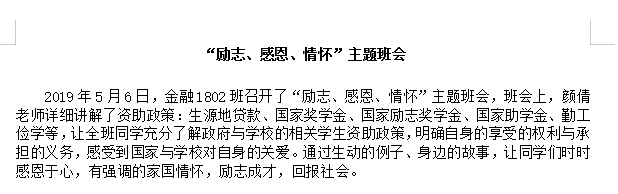 (二)、为了将此次资助政策宣传工作落到实处,我院于2019年5月组织全系各班级开展了“励志、感恩、情怀”主题班会,各班在辅导员的带领下,学习相关文件,辅导员向各位同学详细介绍了我院各项资助政策的具体情况及申请流程,同时开展了多种形式的讨论活动,给学生们上了一堂感恩父母、感恩老师的励志课,使同学们懂得了交流、感恩、诚信的重要性,也深入了解了“励志、感恩、情怀”主题班会召开的必要性及重要意义。