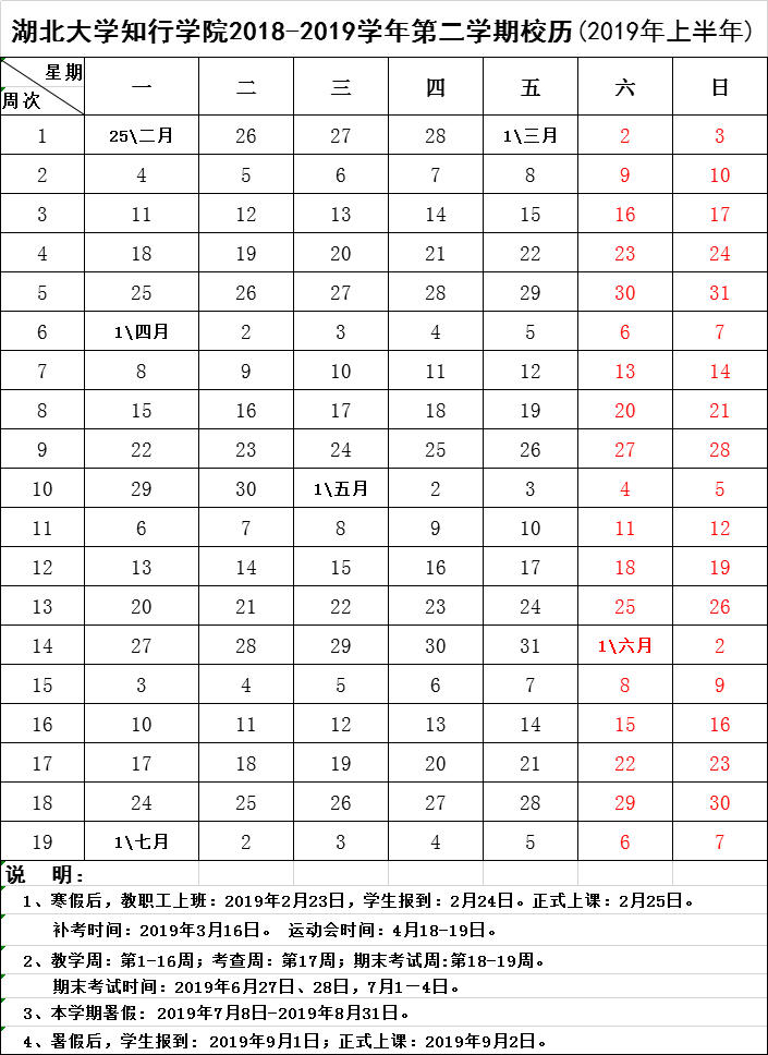 永利集团2018-2019学年第二学期校历(2019年上半年)