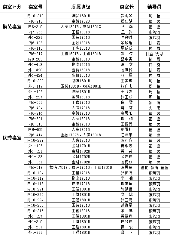 3月7日,辅导员老师以及自律部学生干部对全系187间寝室卫生进行检查和评分,评选出模范寝室5间、优秀寝室36间,名单公布如下: