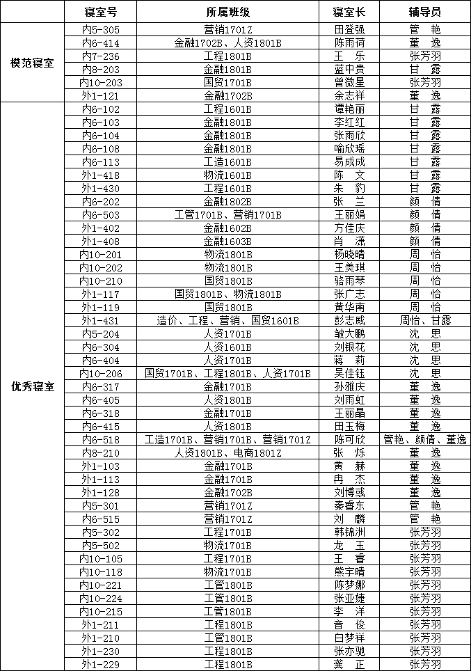 4月3日,经管学院全体辅导员老师以及自律部学生干部对学院187间寝室卫生进行检查和评分,评选出模范寝室6间、优秀寝室43间,望同学们向模范及优秀寝室学习。现将名单公布如下: