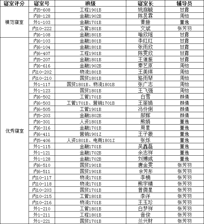 11月14日,经管学院全体辅导员老师以及自律部学生干部对学院270间寝室卫生进行检查和评分,评选出模范寝室5间、优秀寝室30间,望同学们向模范及优秀寝室学习。现将名单公布如下: