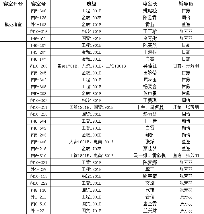 11月28日,经管学院全体辅导员老师以及自律部学生干部对学院270间寝室卫生进行检查和评分,评选出模范寝室5间、优秀寝室25间,望同学们向模范及优秀寝室学习。现将名单公布如下: