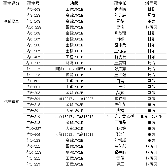 12月12日,经管学院全体辅导员老师以及自律部学生干部对学院270间寝室卫生进行检查和评分,评选出模范寝室5间、优秀寝室22间,望同学们向模范及优秀寝室学习。现将名单公布如下: