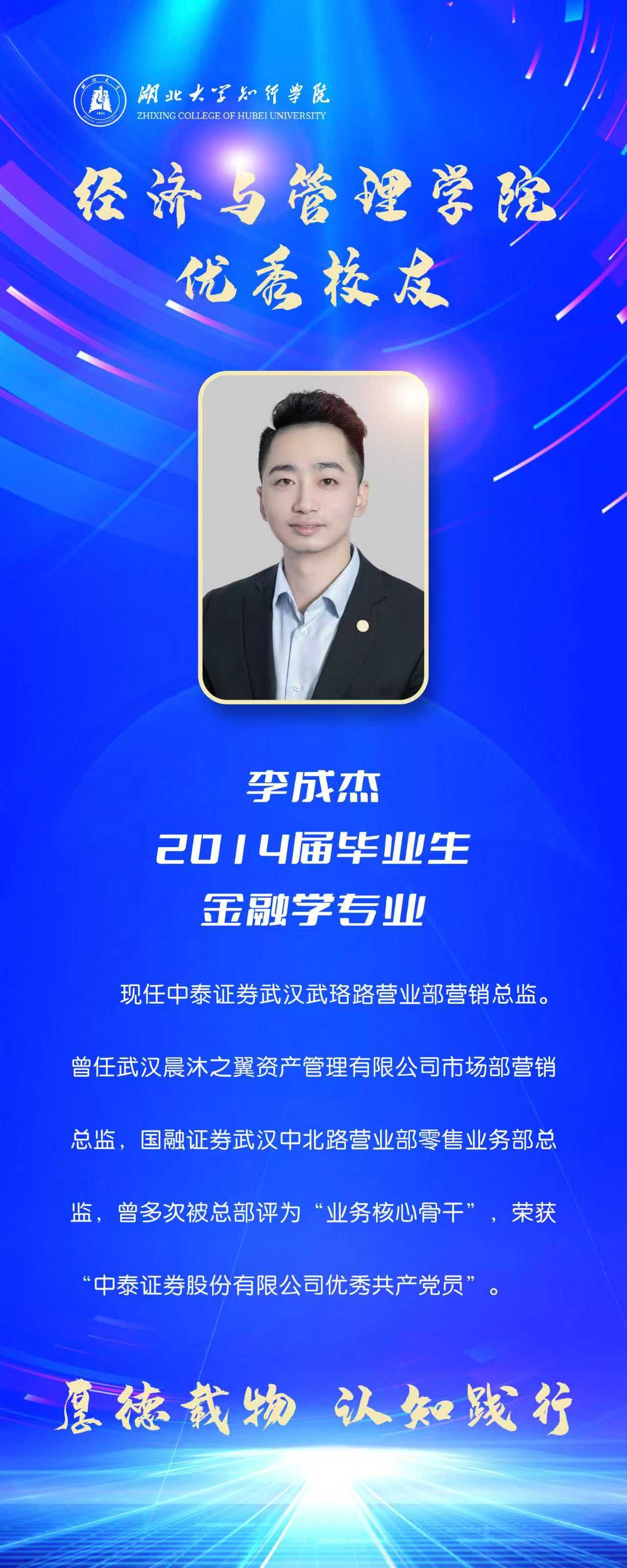 现任中泰证券武汉武珞路营业部营销总监。深耕金融行业多年,他曾担任武汉晨沐之翼资产管理有限公司市场部营销总监、国融证券武汉中北路营业部零售业务部总监,多次被总部评为 “业务核心骨干”,更是 “中泰证券股份有限公司优秀共产党员”。金融市场的波诡云谲中,他的职业之路为学子们提供了宝贵参照。