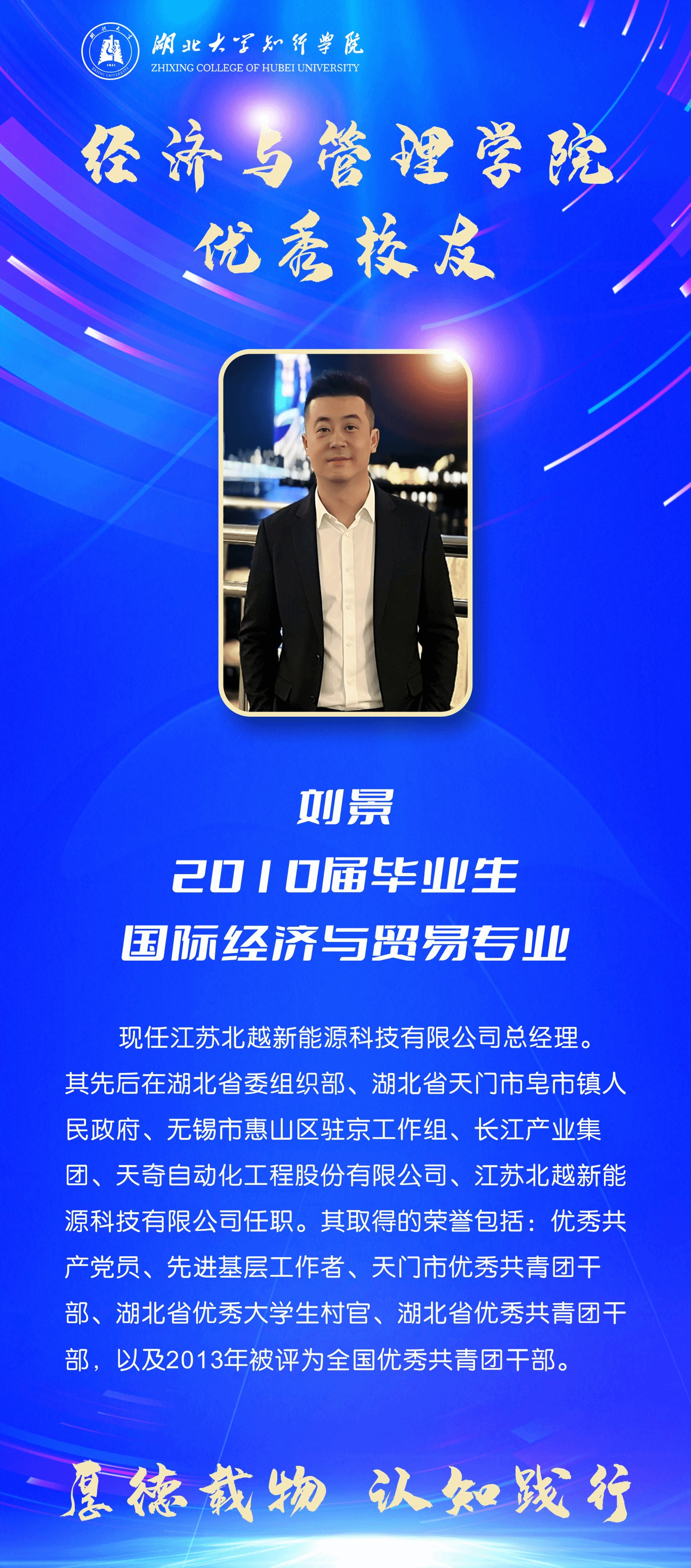现任江苏北越新能源科技有限公司总经理。从校园到职场,他的履历堪称精彩 —— 先后任职于湖北省委组织部、天门市皂市镇人民政府、长江产业集团等单位,在政企各界积累了丰富经验。更斩获全国优秀共青团干部、湖北省优秀大学生村官、先进基层工作者等多项殊荣,用实干诠释着知行人的责任与担当。