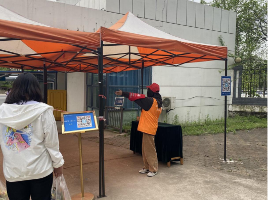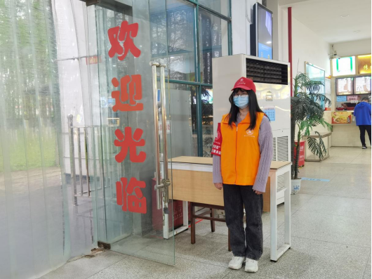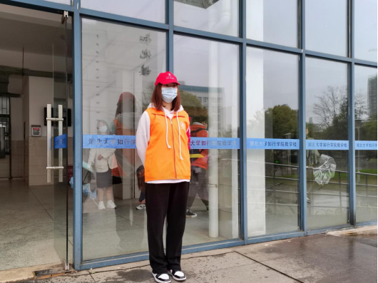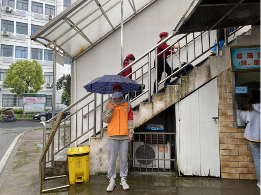 教学楼是我们主要的学习场所,上下课人流聚集,为避免细菌滋生,志愿者们按时执勤,劝阻学生携带早餐进入,为学生营造一个良好的学习环境,共同构筑防疫的坚实防线。