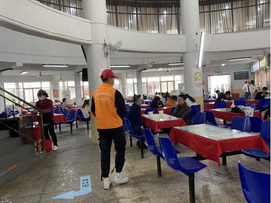 食堂出入口处,志愿者们进行防护宣传,引导同学们按规定出入口进出,食堂内部温馨提醒就餐人员有序排队、同向而坐,在取餐过程中戴好口罩,保持防护距离。严格把控出入口,避免造成拥堵,坚持做到事无巨细,尽心竭力。