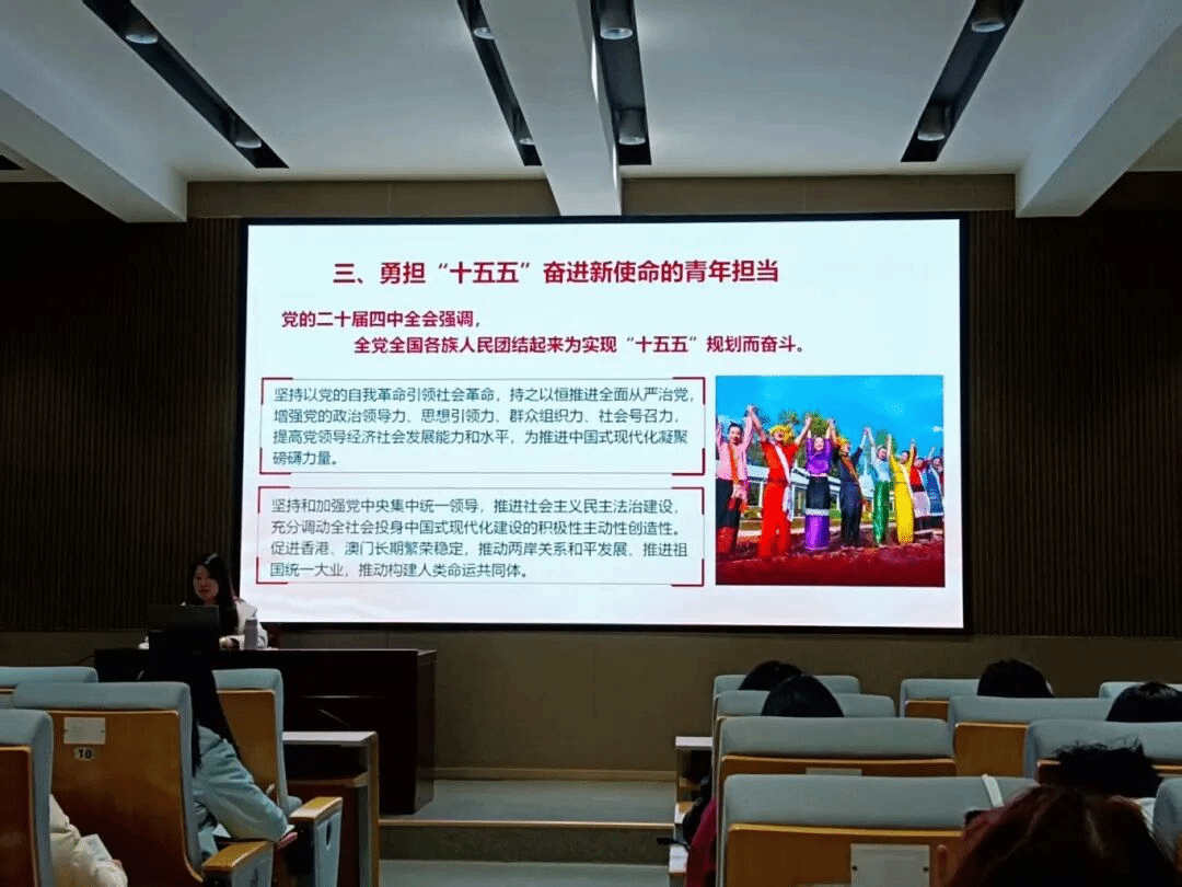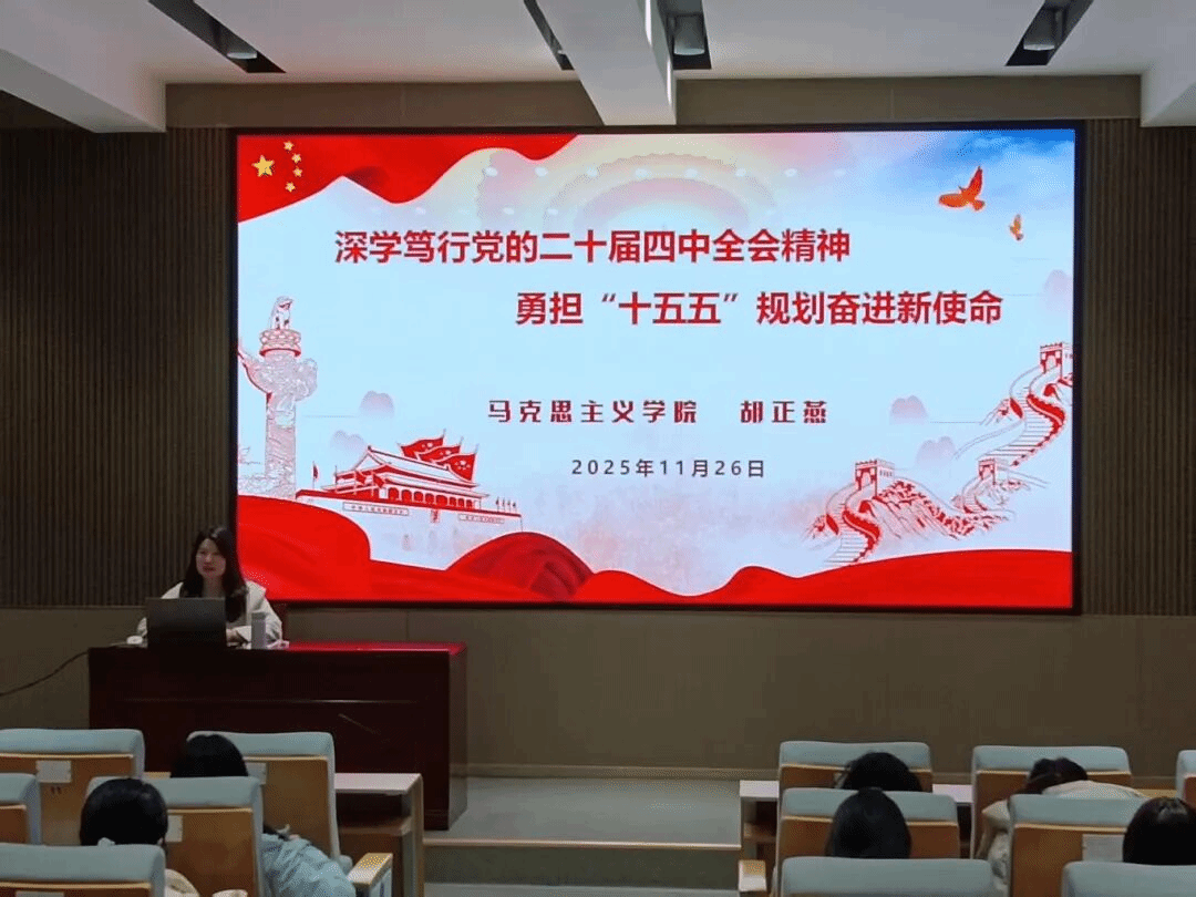 为深入学习贯彻党的二十届四中全会精神,引导青年学子准确把握“十五五”规划战略部署,我院联合外国语学院、人文学院于11月26日18:30在知远楼106报告厅举办了以“深学笃行党的二十届四中全会精神,勇担“十五五”规划奋进新使命”为主题的专题党课。本次党课由马克思主义学院胡正燕院长主讲,我院43期党校全体学员共同参加。