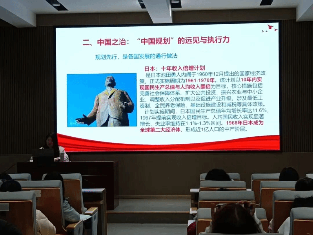 在阐释规划的战略性时,胡老师通过中外对比指出,中国通过连续实施“五年计划”和“五年规划”,实现了从“一穷二白”到世界第二大经济体的跨越发展。她特别以“十四五”成就为例,列举了传统产业高端化、智能化、绿色化转型成果,以及新能源汽车、人工智能、生物医药等战略性新兴产业的突破进展,生动诠释了“一张蓝图绘到底”的战略定力与制度效能。