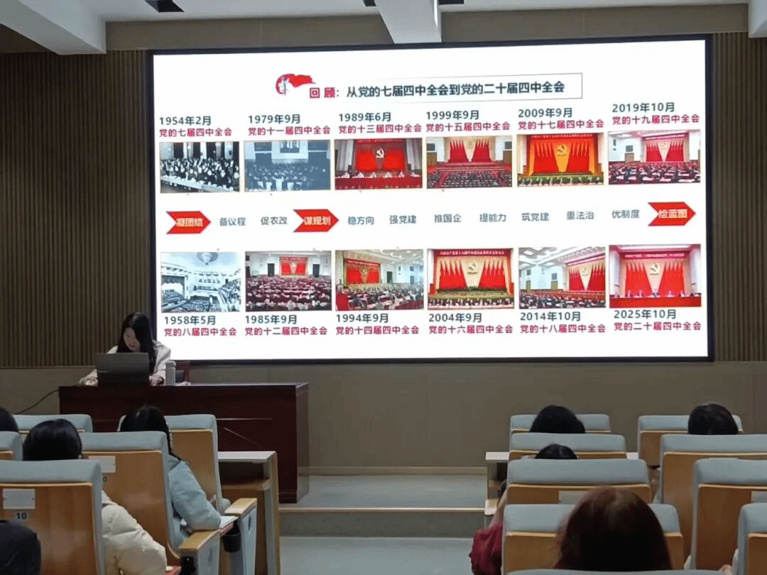 胡正燕老师以“2025年10月”这一关键时间节点为切入点,深刻阐释了党的二十届四中全会在“两个五年”规划历史交汇点上的重大意义。她指出,本次全会作为党内政治生活中的“关键盛会”,聚焦“十五五”规划建议研究,对2035年基本实现社会主义现代化目标作出系统性战略部署。通过梳理自1954年七届四中全会以来历次全会的历史脉络,胡老师强调,二十届四中全会承续“校准航向”的优良传统,以“锚定十五五”彰显了“规划先行”这一中国之治的独特优势。