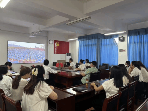 当日上午8时40分,知远楼401会议室主会场已准备就绪。参会人员严格遵照要求,身着白色衬衣、深色西裤或及膝裙的正装,整齐佩戴党徽有序入场,神情肃穆地等候大会开始。与此同时,未能到场的师生也通过抖音、学习强国等线上平台调试设备、提前守候,确保全程参与这一历史时刻。