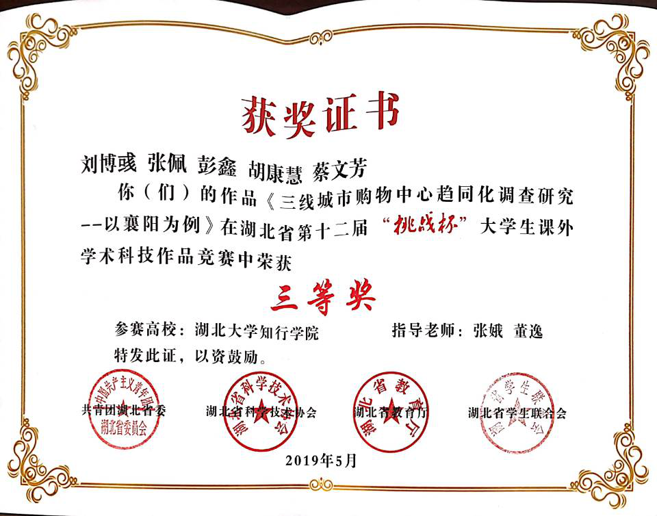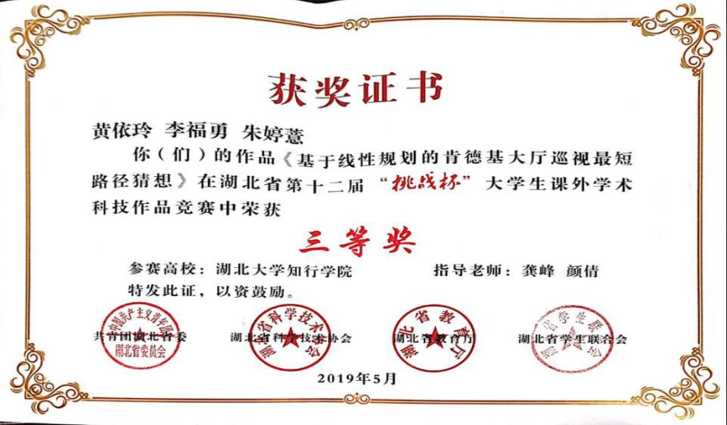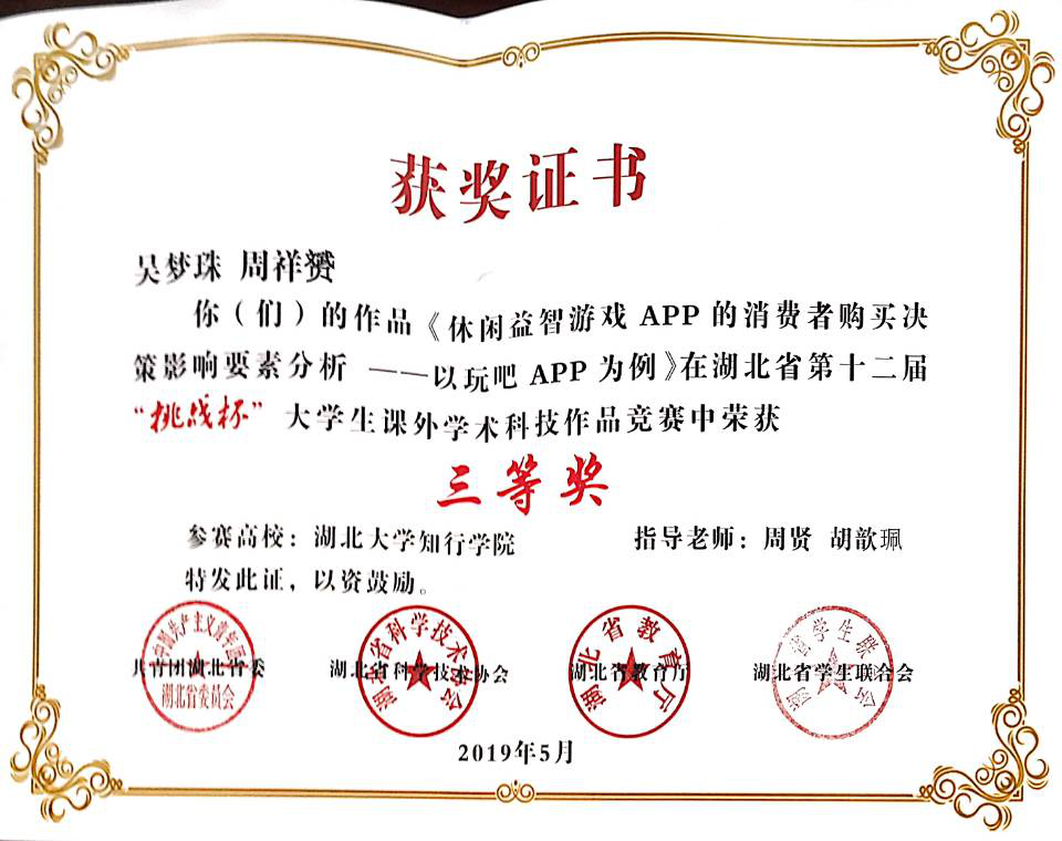 2019年5月 ,湖北省第十二届“挑战杯”大学生课外学术科技作品竞赛终审决赛在武汉轻工大学举行。经过激烈角逐,我院喜获三项三等奖。