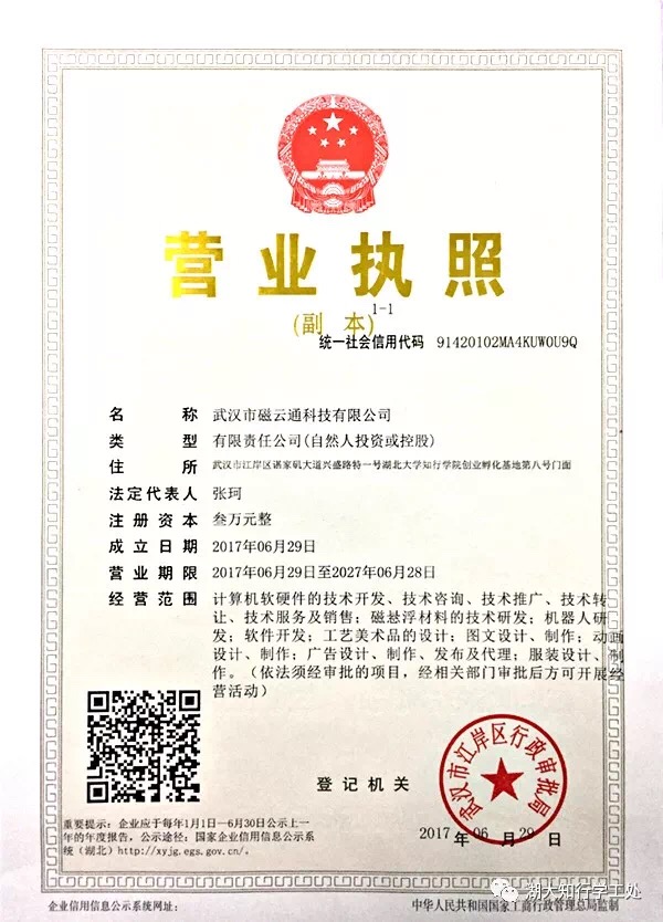 2017年开展《基于工程化物联网系统智慧工厂美洲大蠊产业发展+精准扶贫》项目,带动14名大学生就业并为国家精准扶贫做出明显的贡献。2017年4月入驻学校大学生创业孵化基地,6月,依托创业孵化基地八号店铺成功注册“武汉市磁云通科技有限公司”,为之后创业之路打下深厚基础。2018年1月向国家知识产权局申报专利《四轴消音碟式涵道磁悬浮同轴双旋翼无人机》。同年5月获湖北省大学生创青春创业大赛实践挑战赛铜奖。