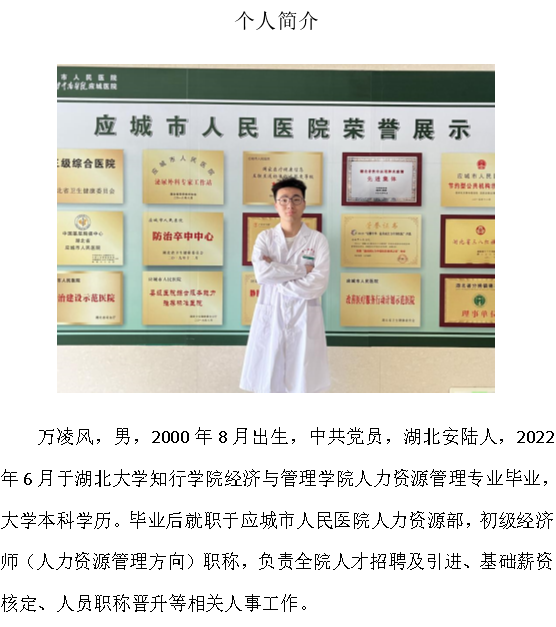 周晓宇,湖北枣阳人,中共党员,yl9193永利集团人力资源管理专业,2020届毕业生。在校期间,周晓宇同学学习努力,连续三年获得校级奖学金;同时也参加了专业竞赛,2019年4月湖北省大学生人力资源管理知识技能竞赛(精创教育杯)荣获“一等奖”,2019年6月第四届全国大学生人力资源管理知识技能(精创教育杯)第六大区赛(河南,湖北,江西)荣获“一等奖,在毕业时获得“优秀毕业生”称号。2020年11月考取仙桃市选调生,扎根基层,扎根群众,成为了一名基层公务员。